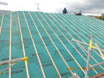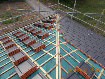 瓦桟を縦桟の上に施工します。こうすることによって、もしも台風などで雨が吹込んでも入った水は軒先まで流れてくれるので雨漏りの心配がほぼありません。
