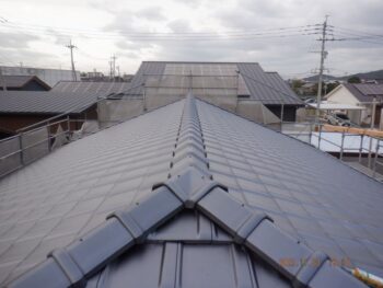 新築屋根工事 産地:三州瓦 メーカー:栄四郎瓦㈱ 使用瓦:平判陶器瓦 プラウドUU40G 色:銀黒色 で施工させていただきました。 |