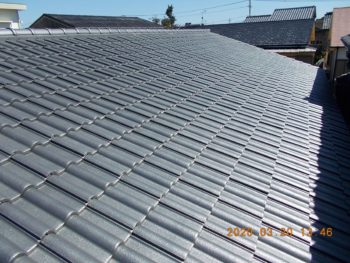 なるべく費用を掛けずに台風などの時も安心したいとの事でしたので 自社(薩南工業)製のセメント瓦ヨーロピアン焼付塗装品でご提案させていただきました。 焼付塗装品ですので、一般的な吹き付け塗装に比べてはるかに高耐久なのが特徴です。 |