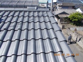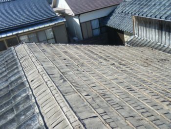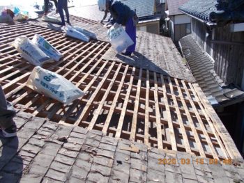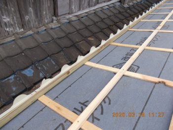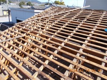 | 施工内容 | 古瓦撤去・平木ノゴメ撤去・タルキ交換・タルキ調整・野地板施工・ゴムアスルーフィング・破風板交換・縦桟施工・瓦施工 |