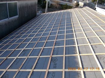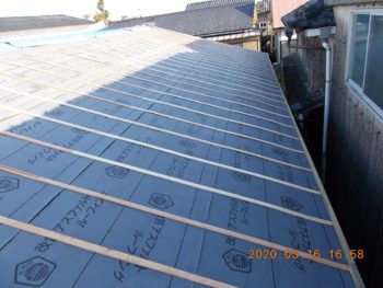 平木も綺麗そうに見えますが、ところどころ桟木が折れていたり、雨漏りでふやけていたりしますし、もし雨が吹込んでも雨漏りしないように野地板へ打ち替えます。
