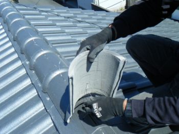 棟瓦をステンレス線で緊結し、なおコーキングで接着していきます