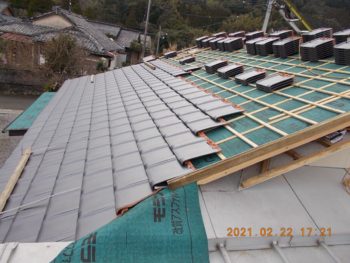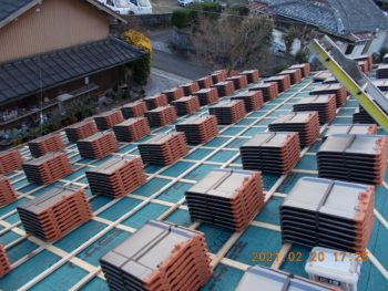 瓦桟木打ち終わると瓦を上げ瓦を葺いていきます