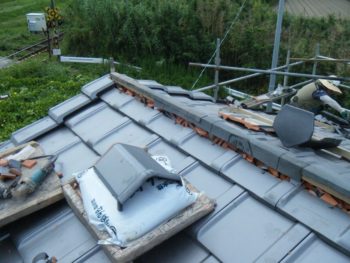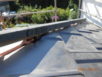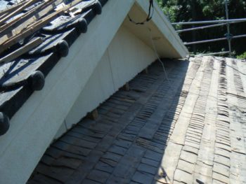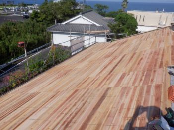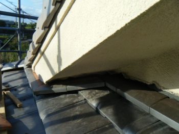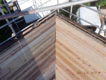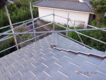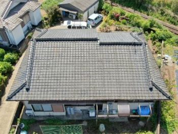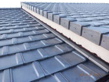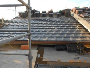| 施工内容 | 既存の古いセメント瓦撤去、平木・ノゴメ撤去、垂木補修、野地板施工、ゴムアスルーフィング、縦桟施工、陶器平判防災瓦施工 |