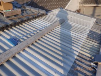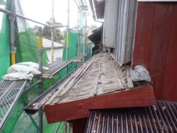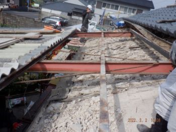 車庫のスレートをいったん撤去して下屋根に取り掛かります