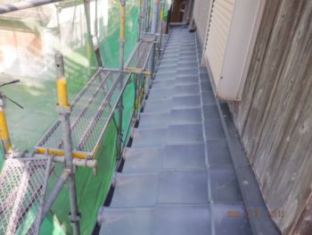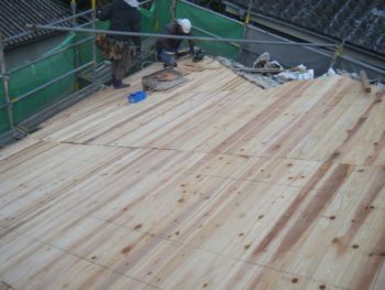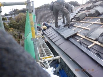 | 施工内容 | 既存の古い日置瓦撤去、敷泥撤去、平木・ノゴメ撤去、タルキ補修・修正、野地板施工、板金工事、ゴムアスルーフィング施工、縦桟施工、セメント和型防災瓦焼付塗装品施工 |