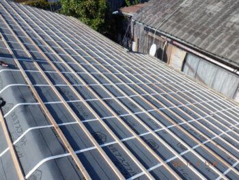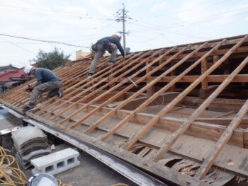 | 施工内容 | 既存瓦撤去~平木・ノゴメ撤去~タルキ交換・調整~野地板施工~ゴムアスルーフィング~縦桟施工・瓦桟木施工~和型防災瓦焼付瓦施工~板金庇施工 |