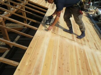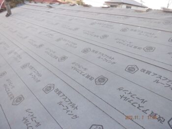 野地板が打ち終わったらゴムアスルーフィング(防水シート)を張ります