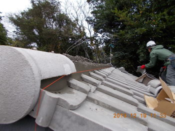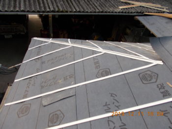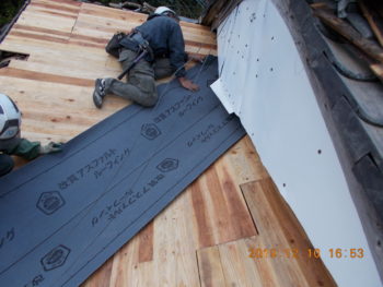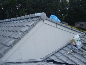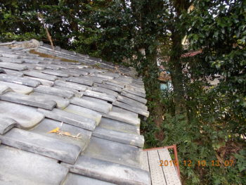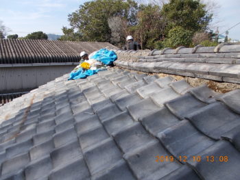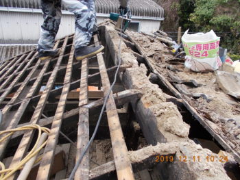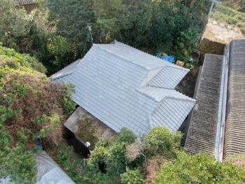 | 施工内容 | 古瓦撤去・平木ノゴメ撤去・棟桁とり替え・野地板施工・ゴムアスルーフィング・谷板金入替・縦桟施工・瓦施工・サイディング工事 |