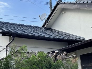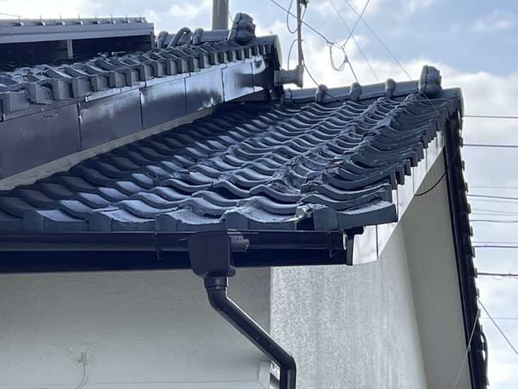 長年の雨風で瓦がズレて落ちそうになっておりましたので、補修をご提案いたしました。 また、雨の日に玄関前の雨樋から雨が落ちてくるという事で雨樋も交換いたしました。 |