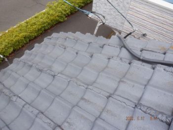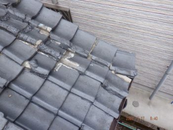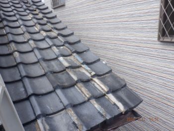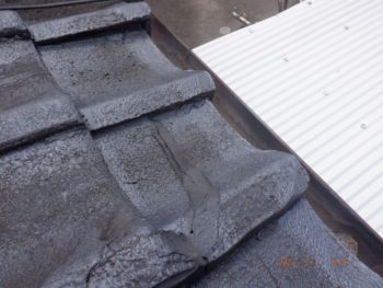 ズレた瓦を素人が補修したのでしょうか?ズレたままセメントで固めてしまっています